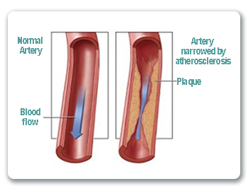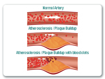 Excess cholesterol in your blood starts piling in the walls of the arteries. Over time, this buildup causes “hardening of the arteries” and formation of a plaque so that arteries become narrowed and blood flow to the heart is slowed down or blocked.