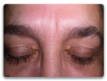 lipid profile .- Yellowish deposits on the eyelids are called Xanthelasmas and sometimes nodular deposits called Xanthomas can be seen in the tendons near the calves, elbows and dorsum of hands.